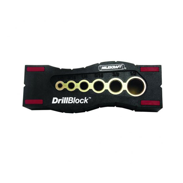 The Milescraft DrillBlock drill guide jig allows you to drill straight holes all of the time, on many different drilling surfaces. On the drill guide bushing block, there are 6 holes for common drill bits sizes. The bushing block is held at a tight tolerance and allows you to drill a hole 90° to any surface, centered on a round item or even directly into the corner of your project.