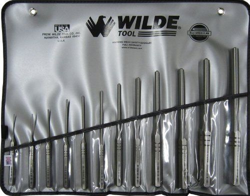 12-Piece Roll Spring Punch Set in a sturdy roll kit vinyl pouch. Each WILDE Roll Spring Punch has a pilot point that fits into the hollow center of the pin. holding the driving shoulder of the punch in perfect contact position. Pins are quickly and easily removed without damage to wall of the hole or pin.